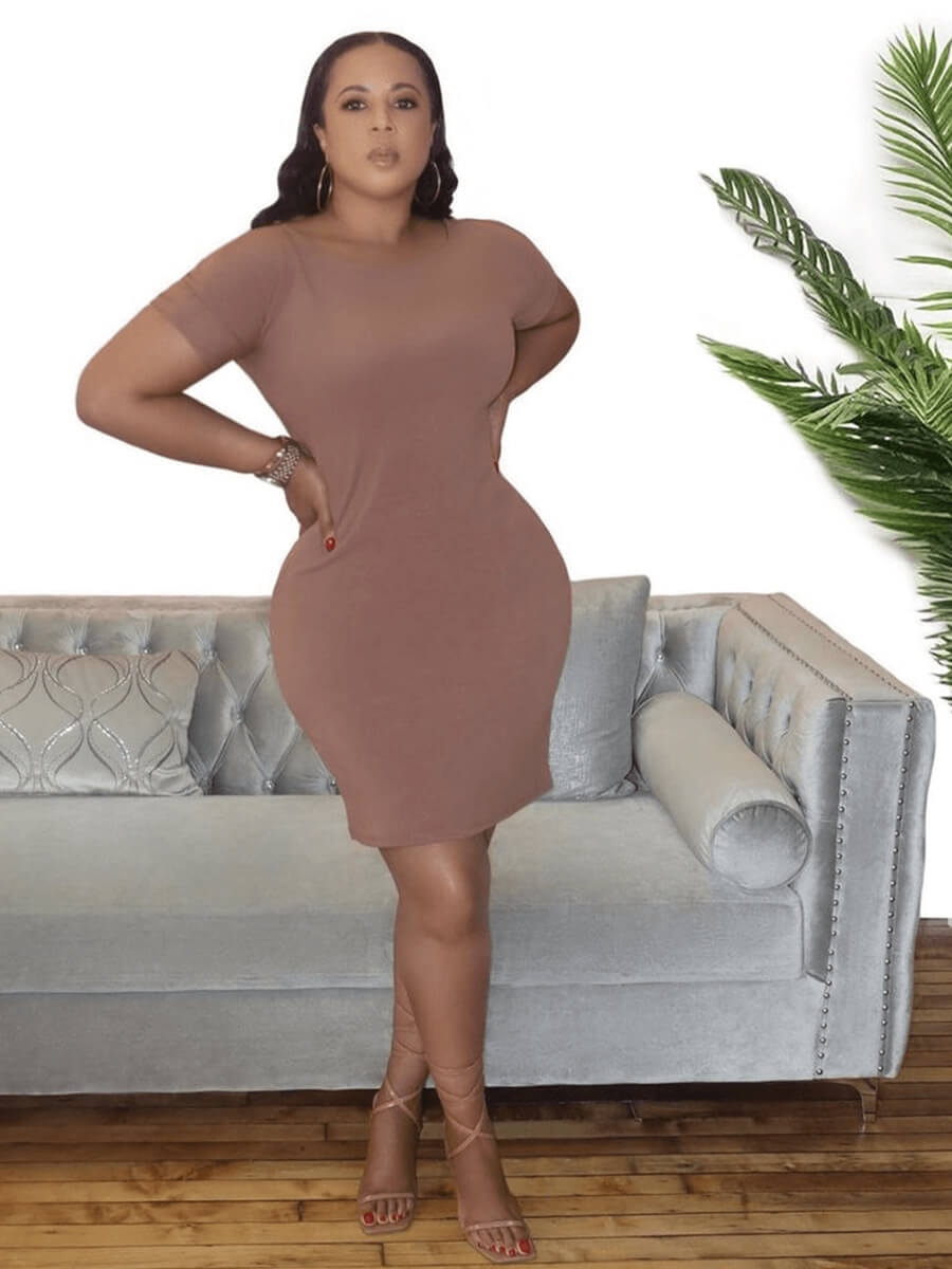 The Basic T shirt Dress is a oversized taupe comfy simple dress that has pockets to it, with cuffed sleeves and can be paired with a sandal.
