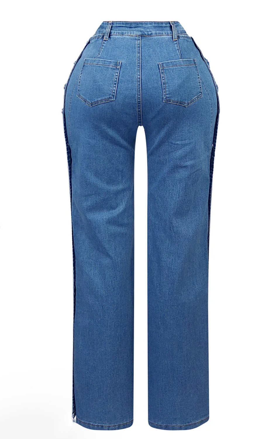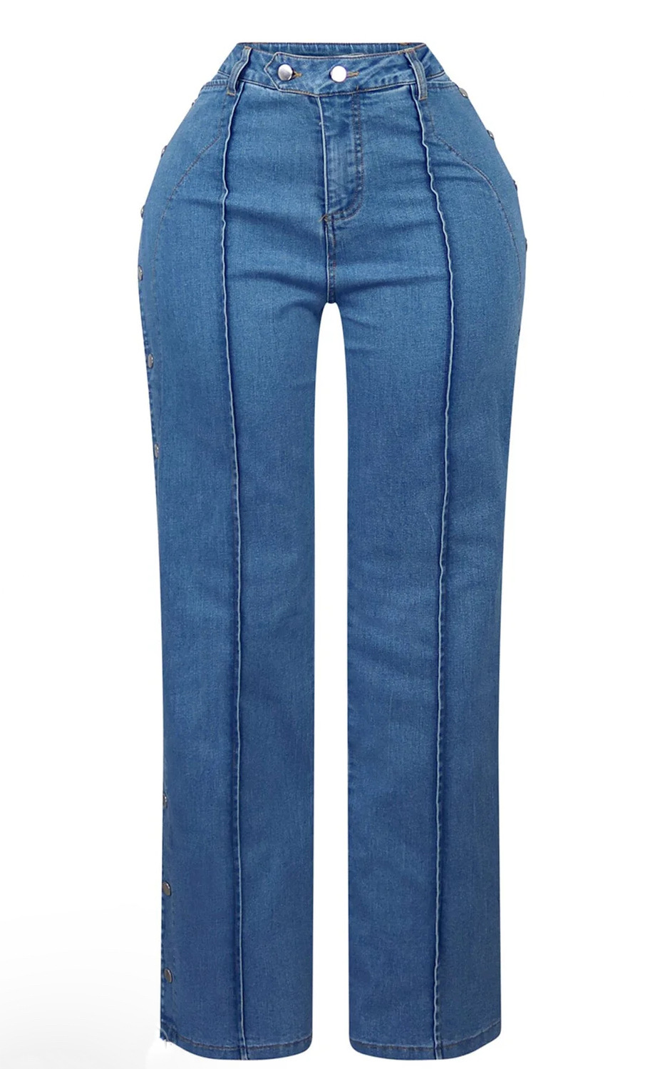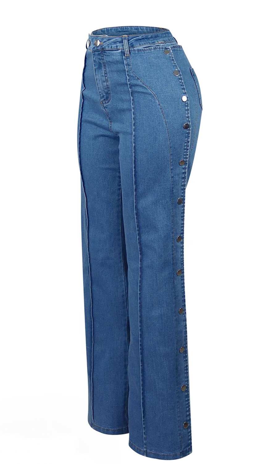 The No Rules Denim Jean is a high-waisted good quality flare jean with a fly button and zip closure. This straight-leg jean also features a side snap button detail that can be unbuttoned for a flirty and sexy look.