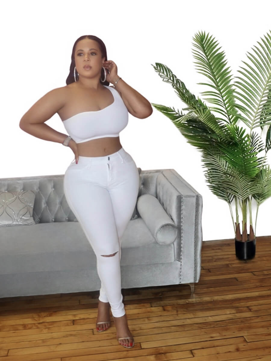 The One Shoulder Tank is a white cotton ribbed tank that has great quality stretch to it, and can be paired with your favorite pair of jeans for a simple chic look.