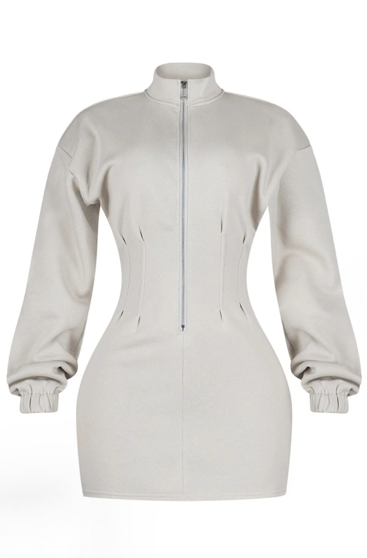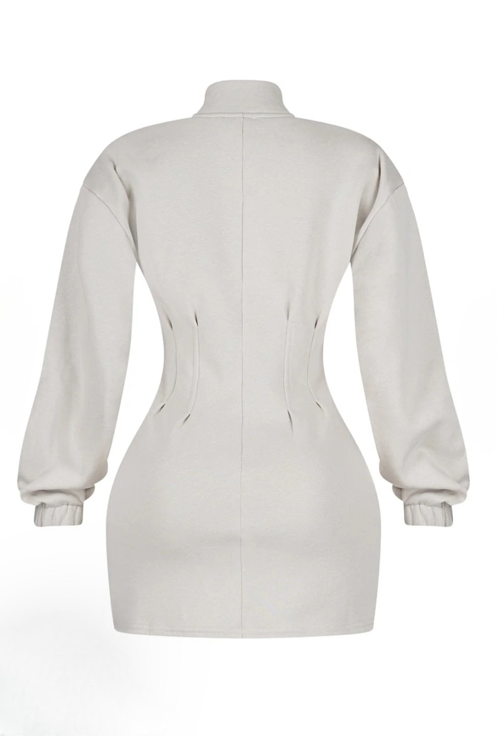 The Allure Dress is a light grey long sleeve jersey material mini dress that features a corset waist to cinch your waist with a front zipper closure. It’s designed to be both stylish and figure-flattering, perfect for a night out or a special occasion.