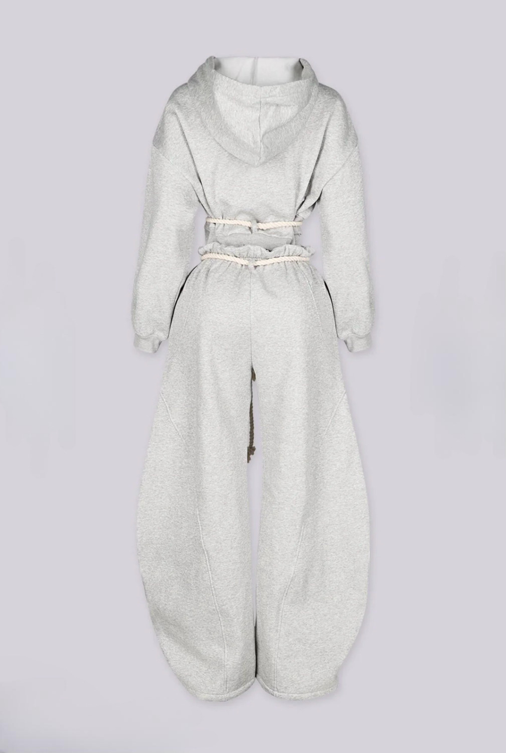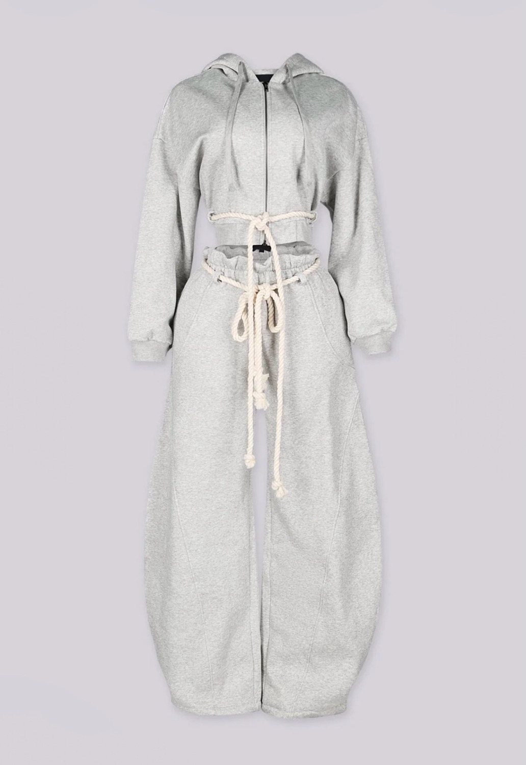 The Chloe Set is a 2-piece heather grey set featuring a zip-up hoodie and wide-leg sweatpants with rope drawstrings for a unique and elevated look.