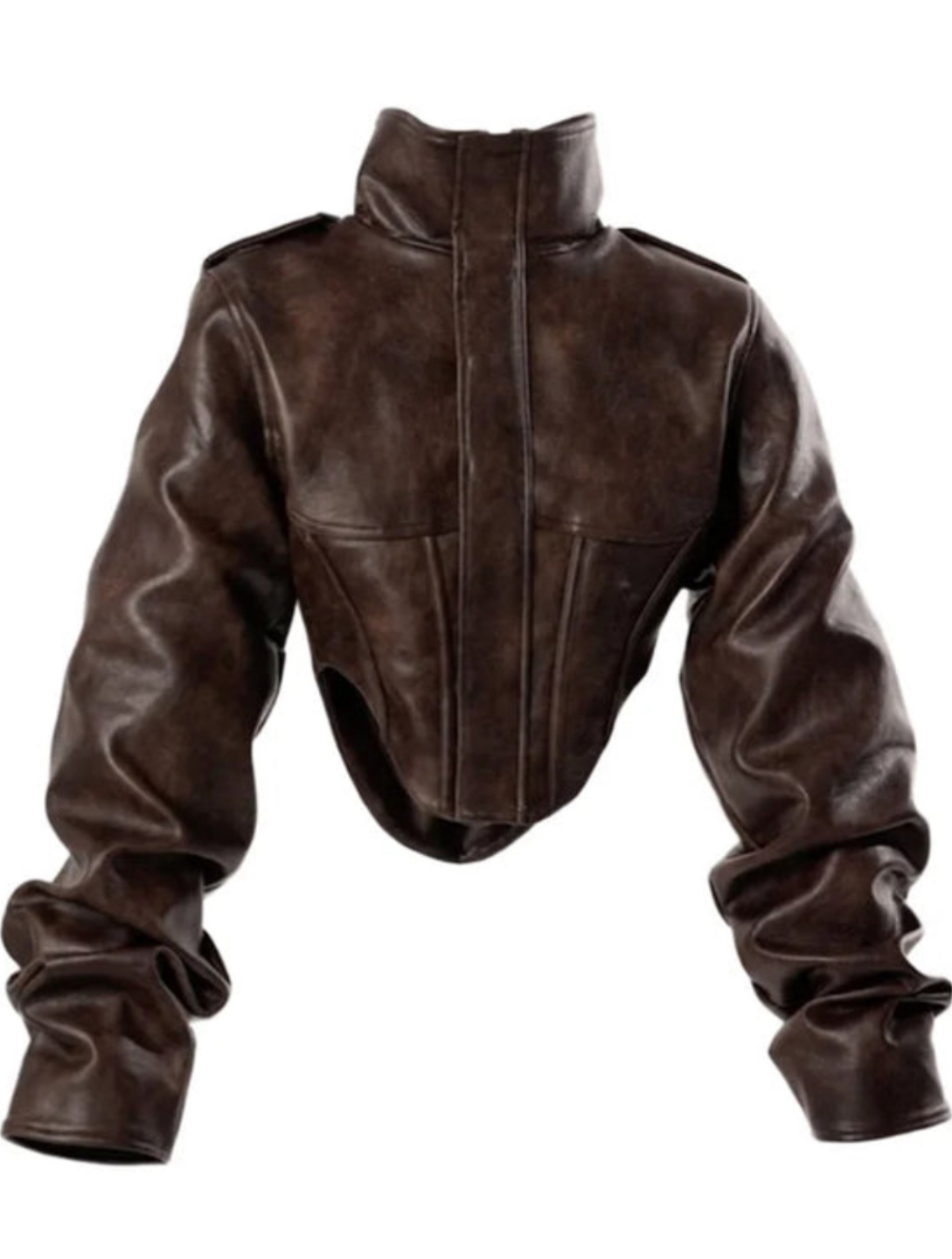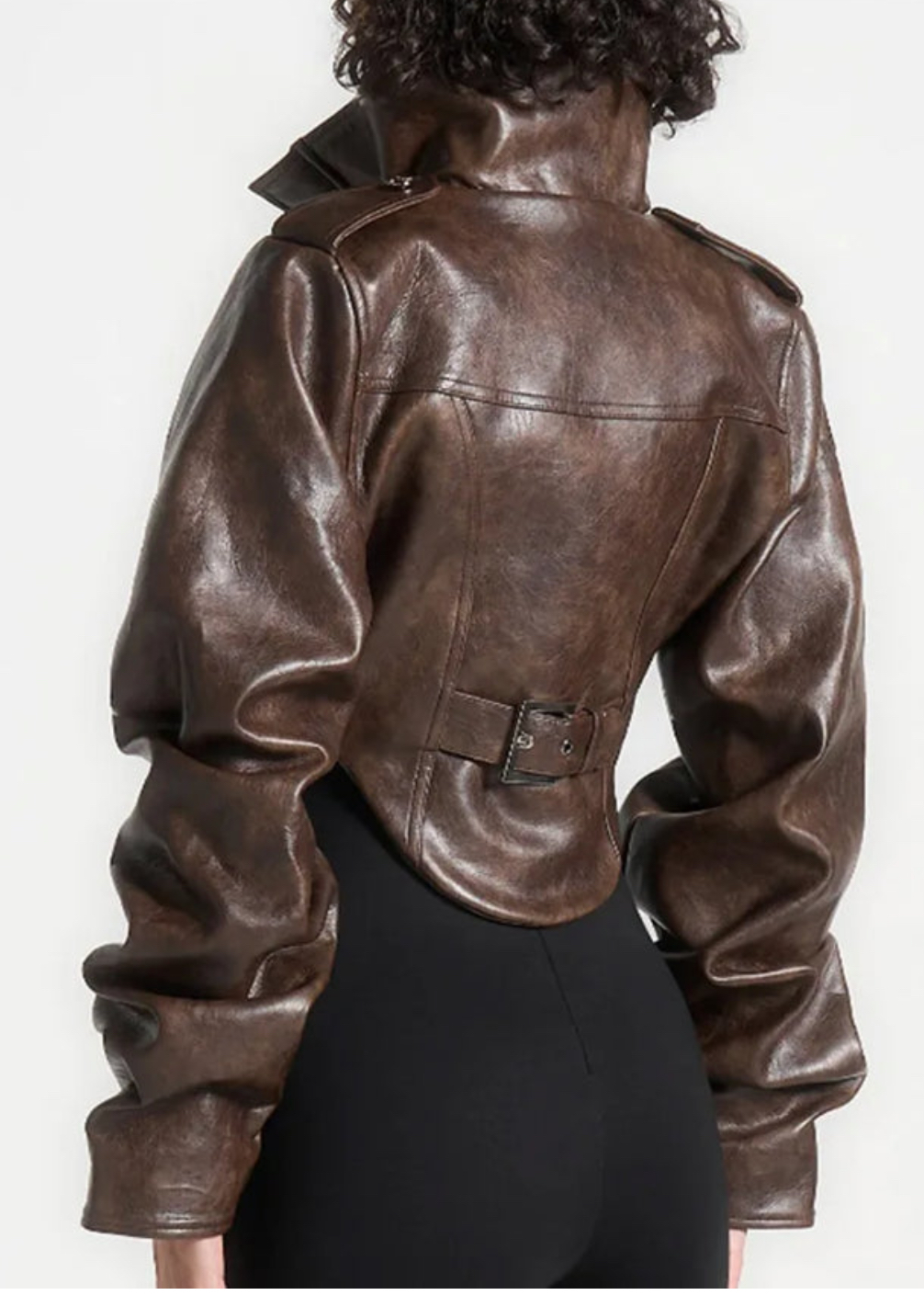 The Demi Jacket is a brown vintage cropped faux leather jacket that has a stand collar with balloon sleeves. This stylish piece adds a touch of retro charm to any outfit. Its unique design features a comfortable fit, making it perfect for everyday wear or a night out.