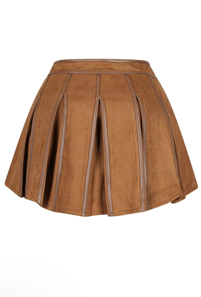The Flirt Skirt is a soft suede pleated mini skirt with a trim of faux leather throughout the pleats. This stylish skirt is perfect for adding a touch of elegance to any outfit. Its flattering design and unique details make it a standout piece in any wardrobe.