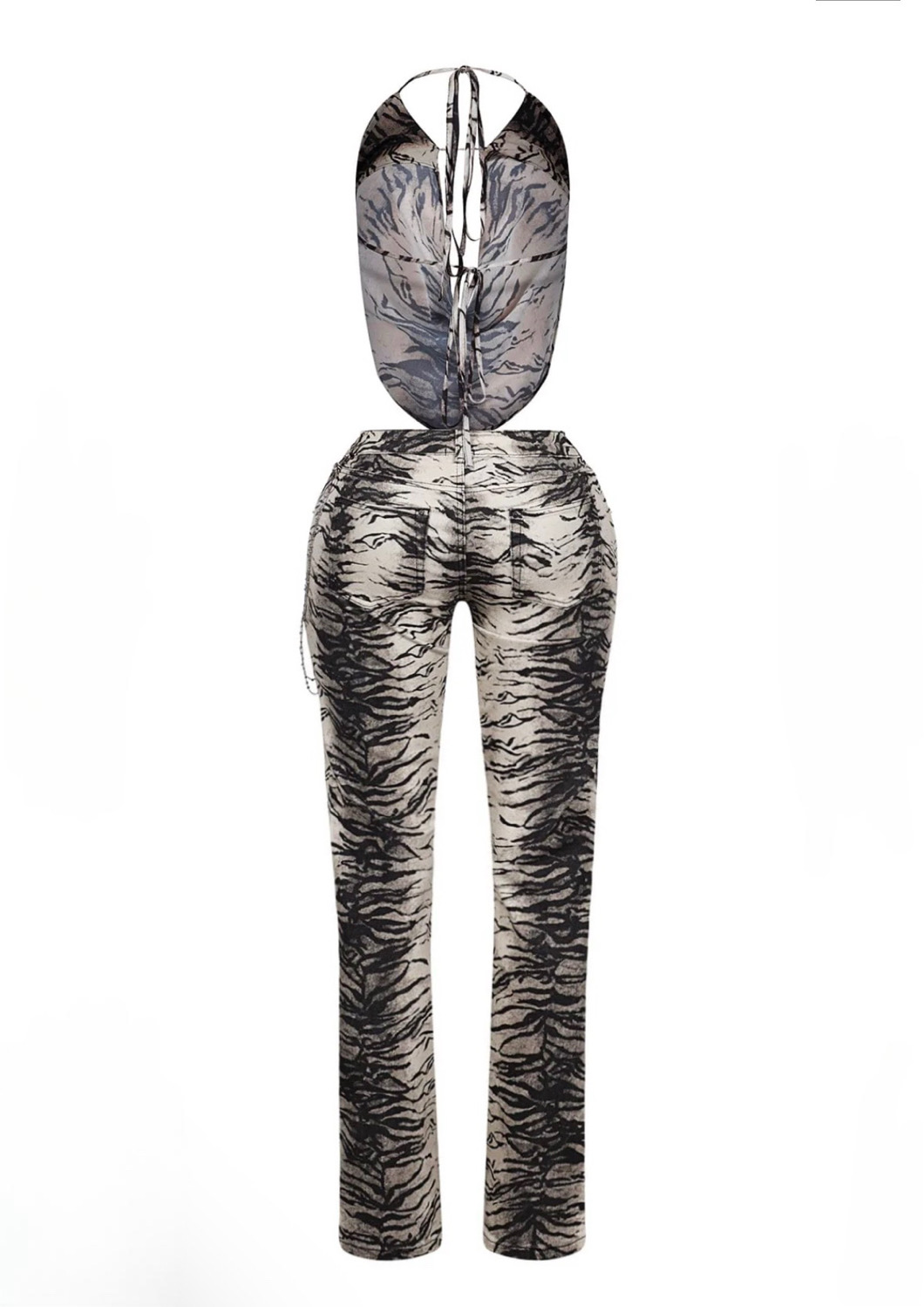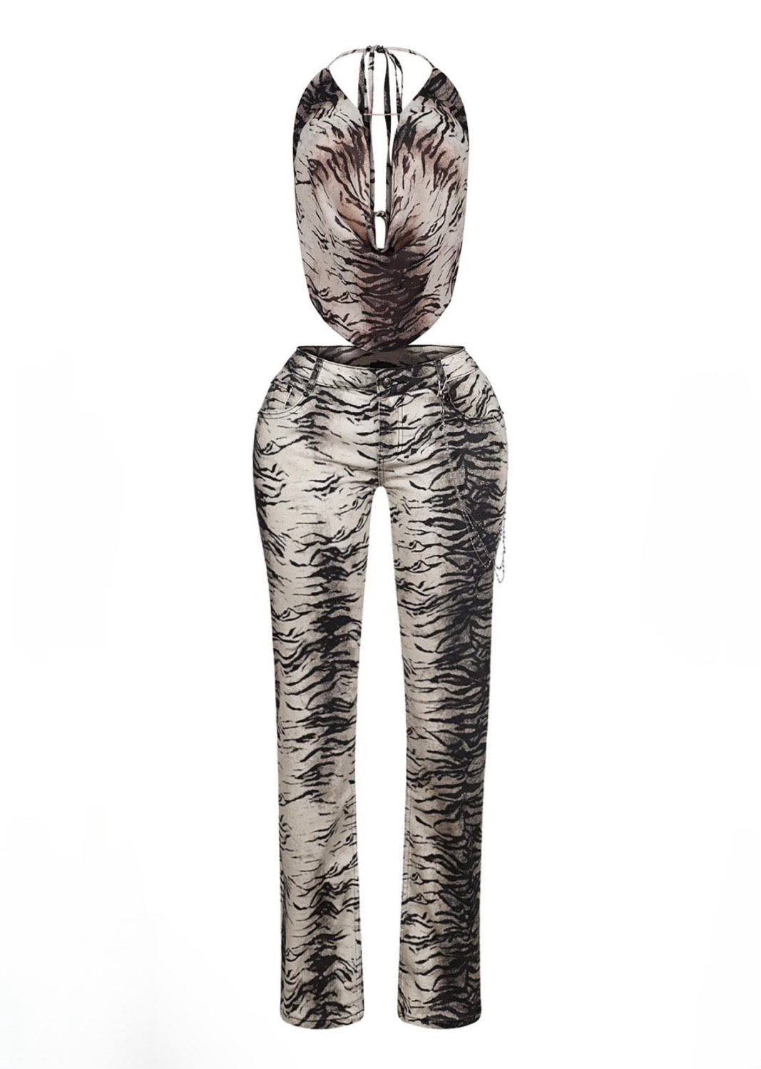The Lex Set is a stunning two-piece ensemble. The zebra mesh strapless halter top features an open back with adjustable neck ties, while the matching high-waisted flare pants boast a chic silver waist chain. Perfect for date night or night out with the girls.