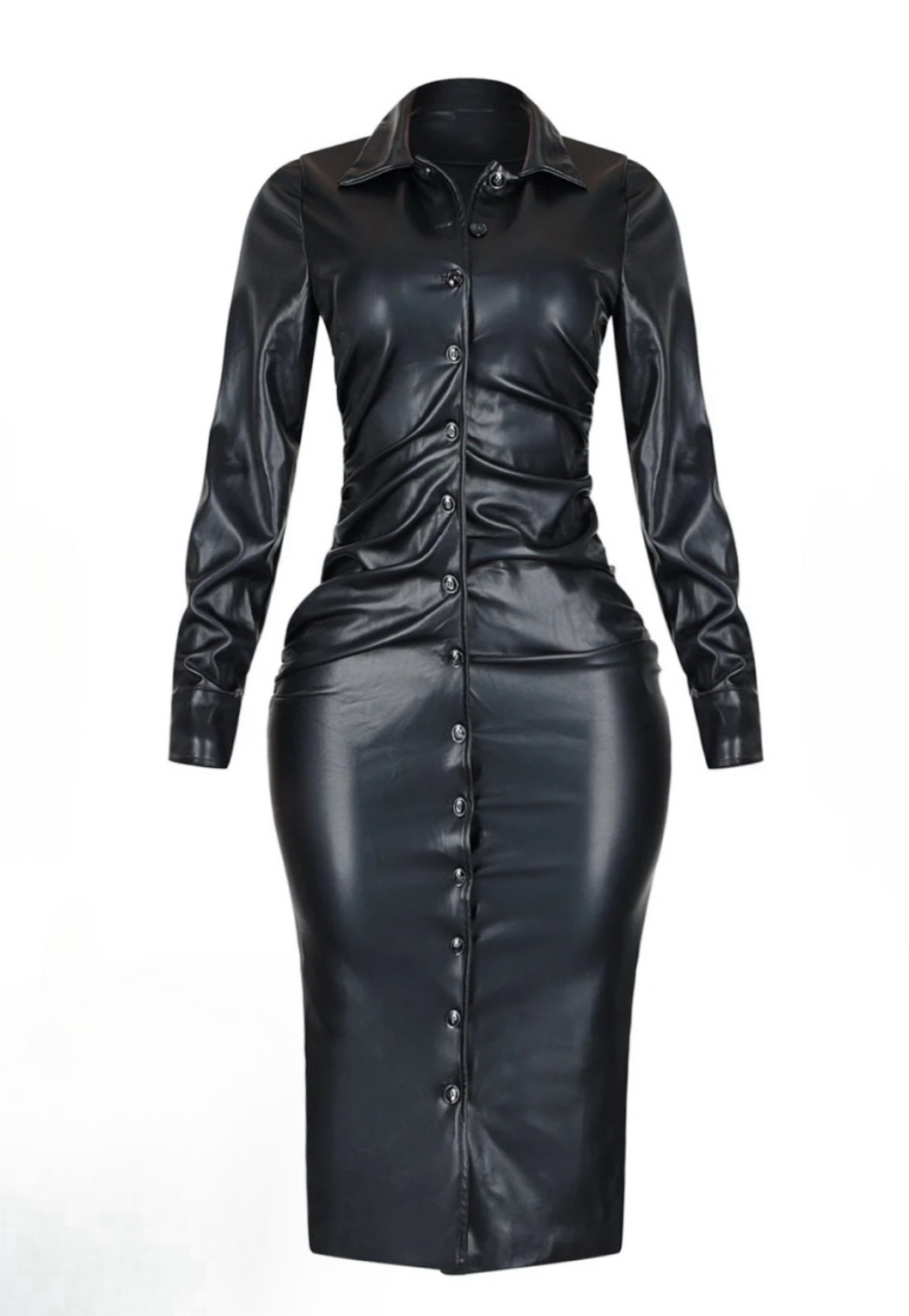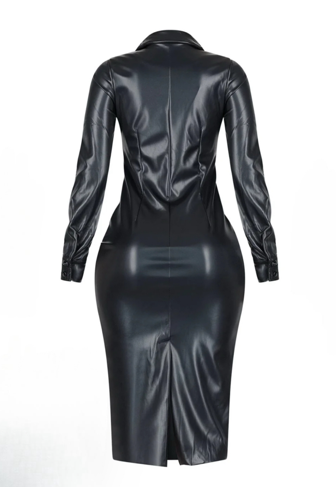 The Luxe Shirt Dress is a fully lined faux leather long sleeve collard midi dress that has a snap button closure this dress ensures you’ll feel as good as you look. Perfect for nights out or special occasions, pair it with statement heels and bold accessories for a show-stopping ensemble that exudes confidence!