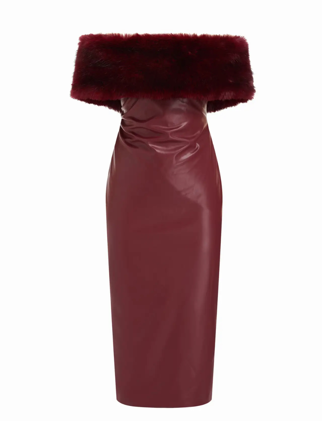 The Nina Faux Leather Dress is a stunning burgundy maxi dress, featuring a bodycon silhouette crafted from faux leather. It’s beautifully lined and designed with a chic bandeau style, complemented by a delicate faux fur trim and an alluring off-the-shoulder neckline and a split in the back of the dress.. This dress is can be worn for any occasion.