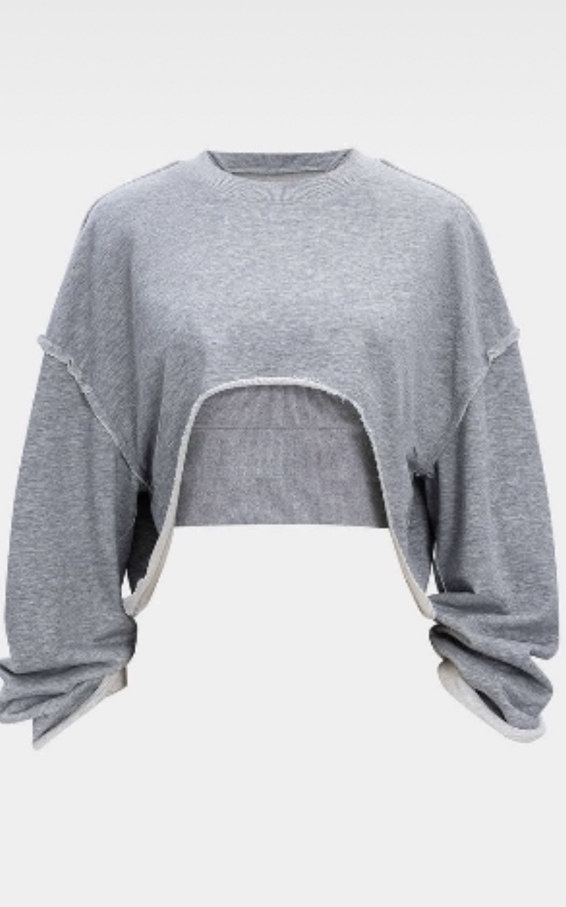 The Rebel Cropped Sweatshirt is a grey long sleeve crewneck dropped shoulder cropped sweatshirt that has a tank attached to it, creating a cinching waist. This unique design offers a stylish and flattering fit for any occasion. Pair this top with your favorite joggers or denim for a chill but cute look.