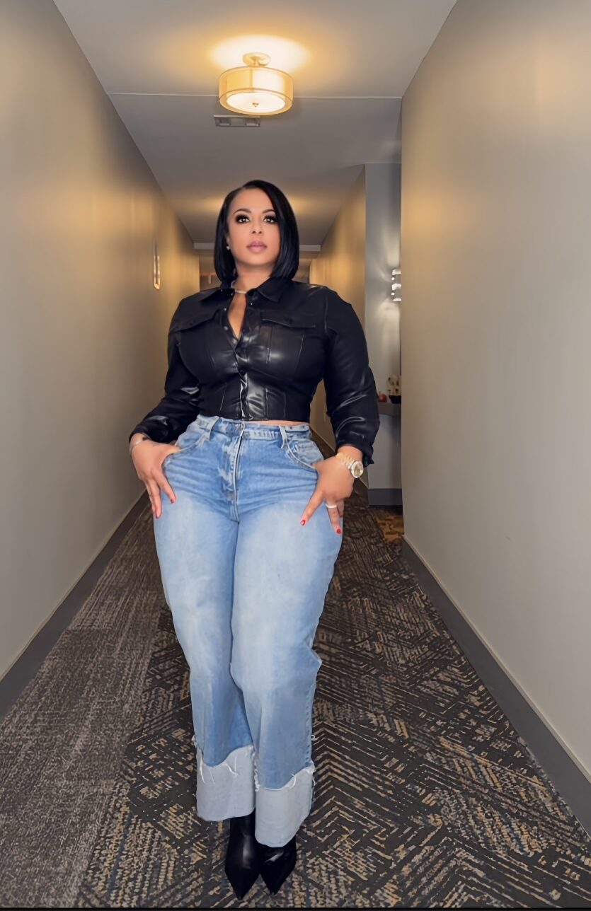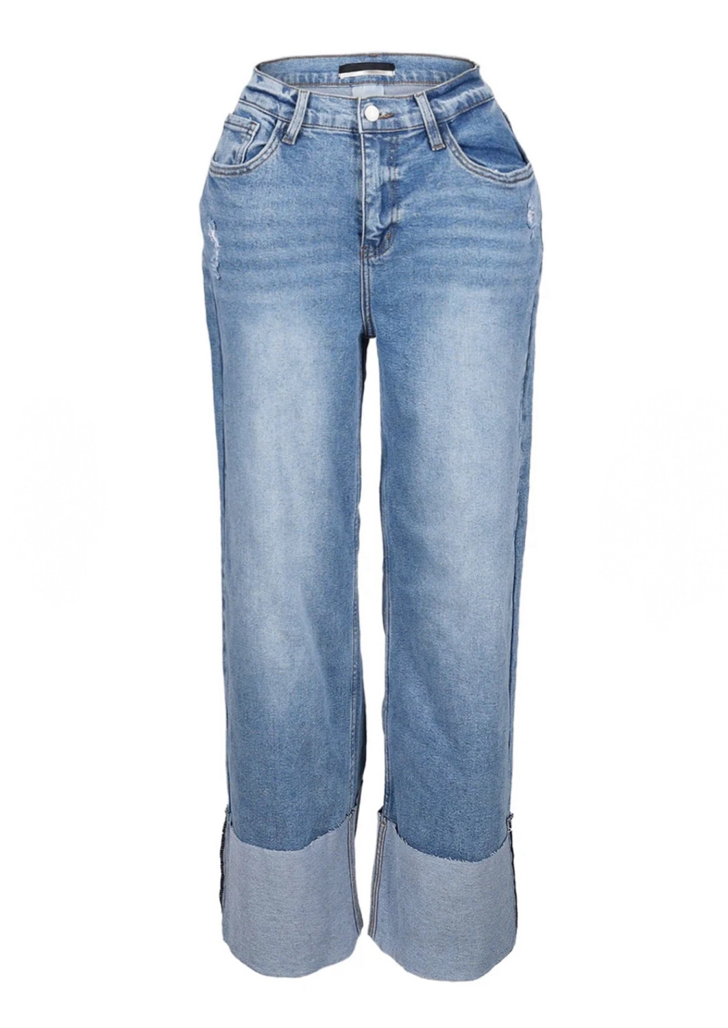 The Unapologetic Jeans are a denim high-waist straight jean featuring a hem cuff, fly button, and zipper. Pair them with a cropped sweater, a stylish top, or even a jacket for a complete, polished look.